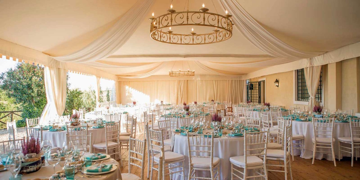 - Capienza: due saloni climatizzati (fino a ~170–180 ospiti); tensostruttura per oltre 200 persone; spazi esterni fino a ~400 invitati (in base al layout).